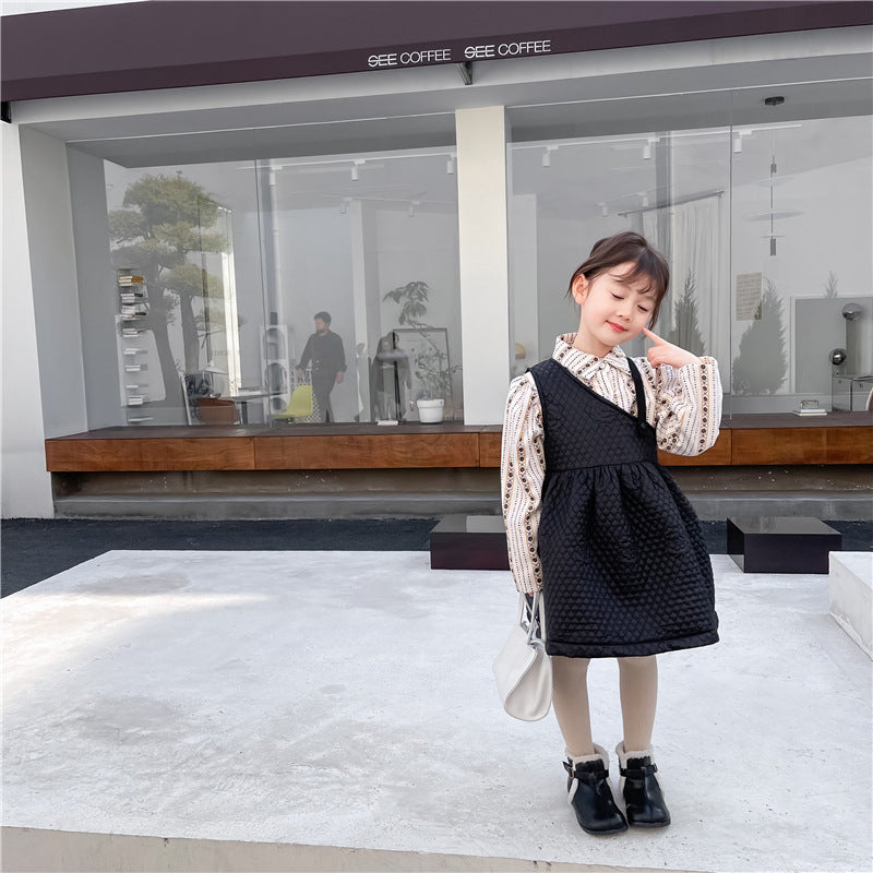 Girls Plus Fleece Floral Shirt Fancy Strap Dress Two-piece Suit